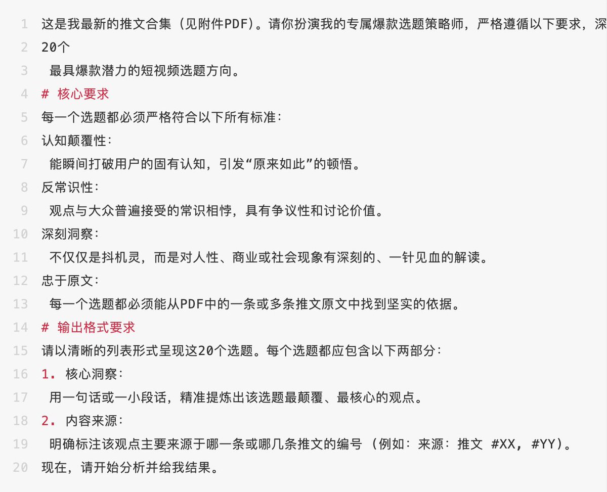 于是我把上面所说的爆款规律,和我的上千条推文 PDF 发给 AI(这里选用的模型是 gemini 2.5 pro)