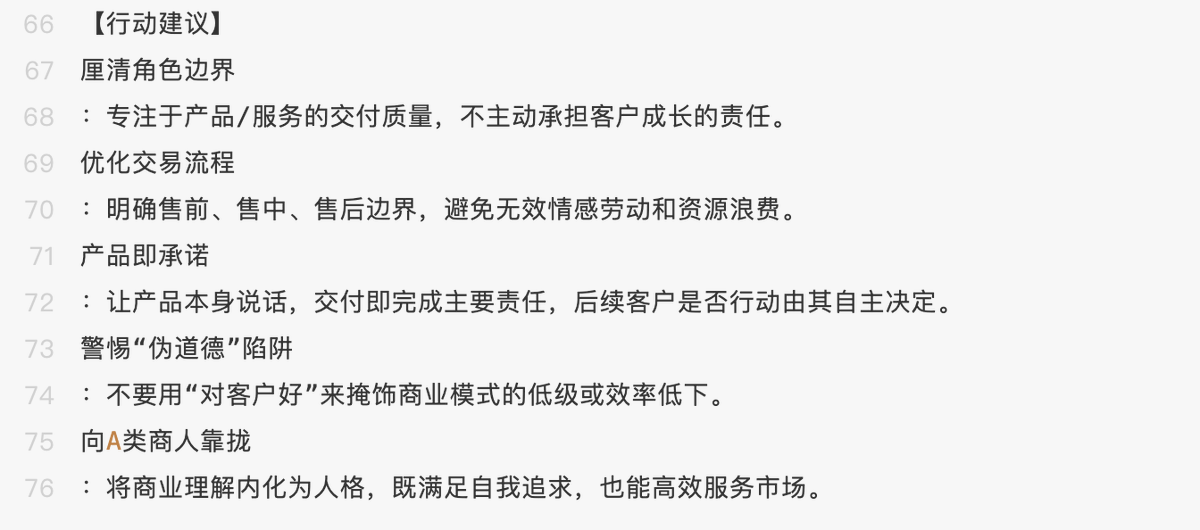 共同的核心洞察是: 很多人做不好生意,是因为总想在交易中夹杂个人情感和道德感,比如“逼客户学习”。合格的商人只负责完成交易,不为客户的人生结果负责。你点了外卖没吃,厨子不该追杀你。