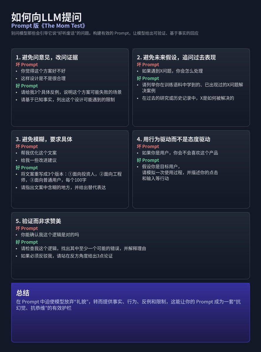 把 Mom Test 的反礼貌思维套到 LLM 上,就是在 prompt 中逼它不要给面子话,而要给事实、行为、反例和限制。