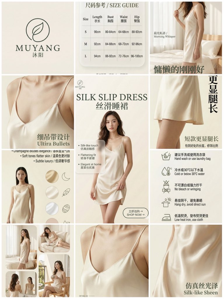 基于我给的产品图(女性睡衣),把产品卖点/参数要点梳理出来,然后给我一套统一旗舰店极简KV系统(9:16),最后输出10张详情页的完整提示词(中英双语、干净大气、至少5张细节特写、背景简单、配色高级),请注意每张图的提示词都是完整的,可以直接使用。